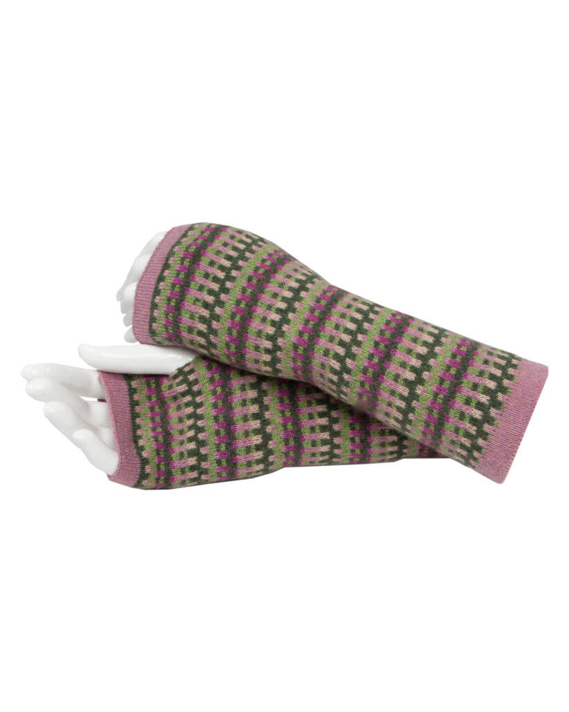 Geo Wrist Warmers Rose Pink, Verdant and Magenta 2